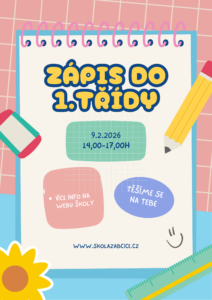 Zápis do ZÁKLADNÍ ŠKOLY TERMÍN ZÁPISU: PONDĚLÍ 9. ÚNORA 2026, 14:00 – 17:00 Elektronická přihláška- ZDE Organizace a průběh zápisu...